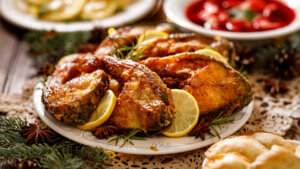 V den Štědrého dnu 24.12. je tradicí, že se sejde celá rodina k sváteční večeři. Ta se vždy skládala z rybí polévky, smaženého kapra a bramborového salátu. V modernějším pojetí je stále více tradiční kapr nahrazován lososem, štikou či pstruhem. Během konzumace večeře panovaly jisté zvyky. Například se prostřelo o jeden talíř víc pro nečekanou návštěvu nebo se dávala mince pod talíř. Ten, kdo ji nalezl měl mít jistotu, že se u něho budou celý rok držet peníze. Pro všechny byla tradičně pod talířem skovaná i šupina z kapra, která měla přinášet celoroční bohatství a vyhnout se chudobě. Opuštění štědrovečerní tabule v průběhu stolování nosilo smůlu.