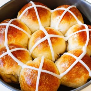 Tady jsme asi nejblíže k našemu mazanci. Hot cross buns neboli bochánky s křížem jsou sladkou, kořením vonící buchtou z kynutého těsta plnou rozinek, proslazované kůry nebo jiného sušeného ovoce. Tradičně se podávají na Velký pátek a jsou velikonočním pokrmem nejen ve Velké Británii a Irsku, ale i v Austrálii, na Novém Zélandu, v Kanadě, Karibiku, Jižní Africe a Indii.